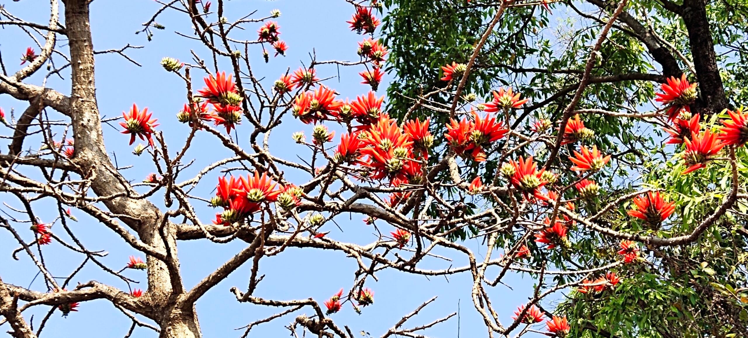clusters of scarlet or crimson flowers and black seeds. Coral tree puts on